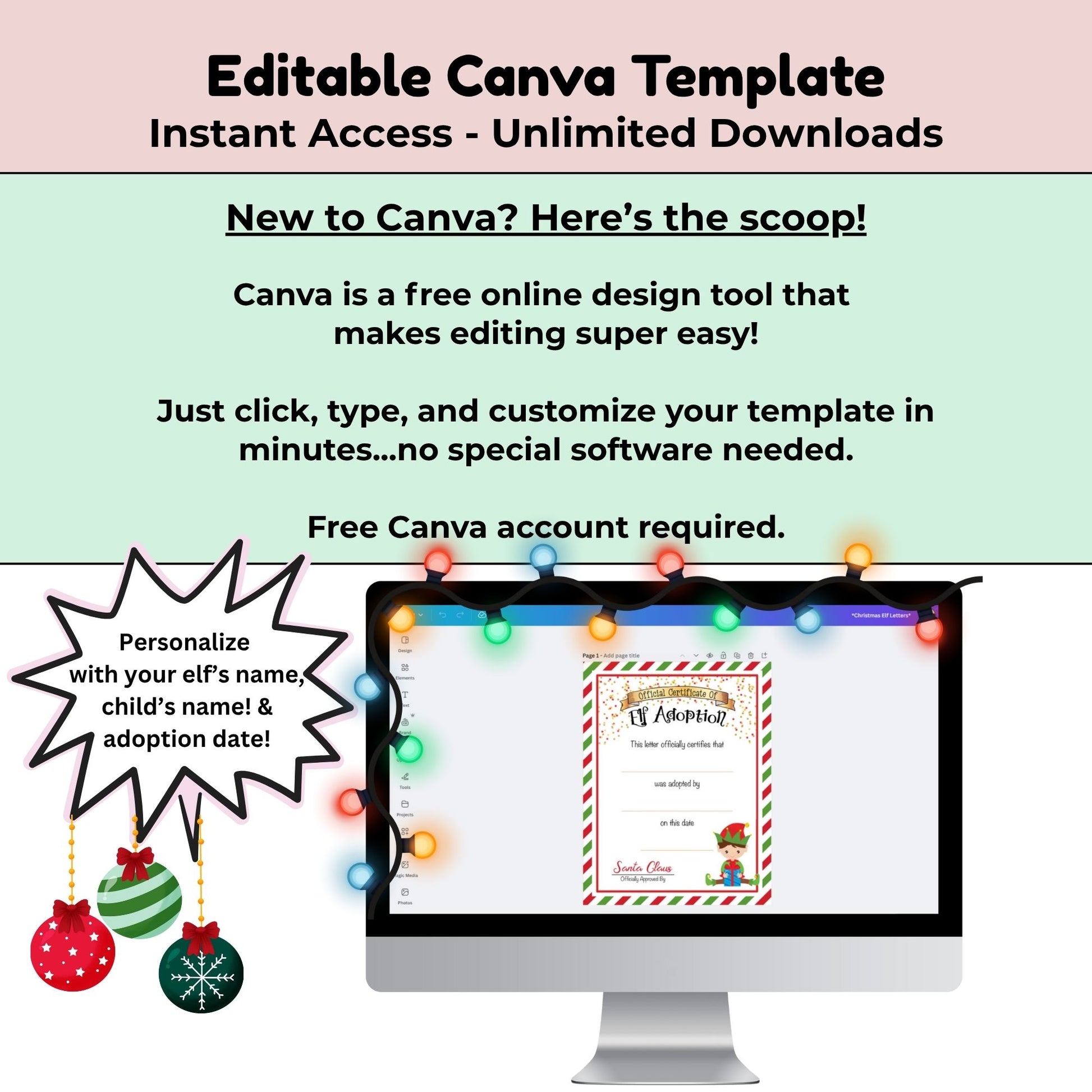 Celebrate your elf’s official arrival with this Editable Elf Adoption Letter Printable. Easily personalize your elf’s name, your child’s name, and the adoption date in Canva to create a magical keepsake they’ll treasure year after year. This set also includes a bonus Elf Ideas printable filled with fun, creative ways to keep the holiday magic going all season long.